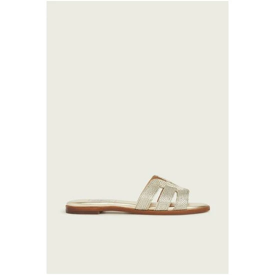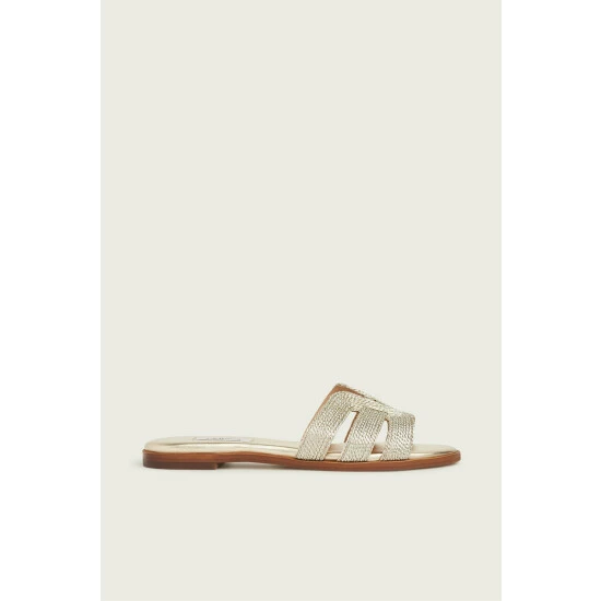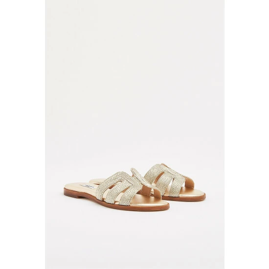Every spring we love this gold metallic rope flat sandals, and this season we welcome Riley to this collection. Crafted in Spain from soft metallic fibre gold rope, they’re a backless mule style with three straps woven into a graphic design over the toes. Wear them with summer dresses and skirts for everyday style with a touch of gold.