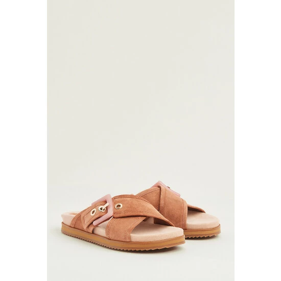 The Rory mules are crafted in Spain from dark rose pink suede. They are a slip-on mule with crossover straps over the toes with matching buckle detail and a footbed flat sole.