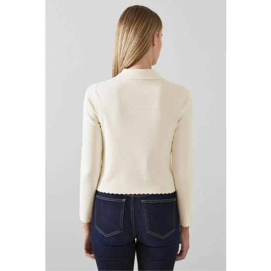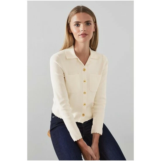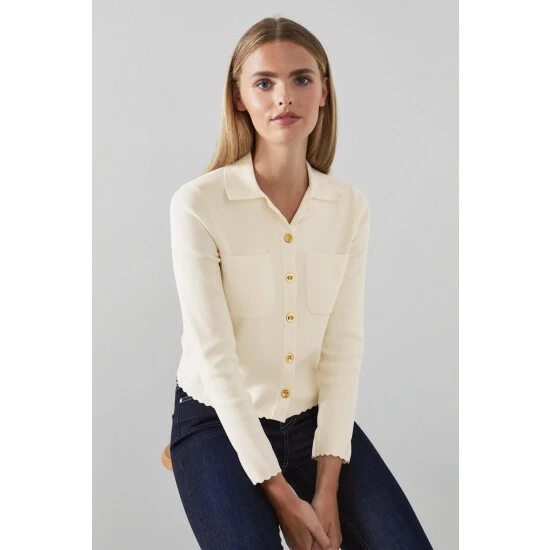 The Rosamund knit is crafted from a cream knit. It has a neat collar, patch pockets to the front, it buttons through and is finished with a scallop edge to the cuffs and hemline.