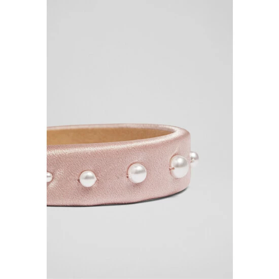 The Sadie headband is crafted from rose pink satin. It’s a classic padded style embellished with a row of pearls.