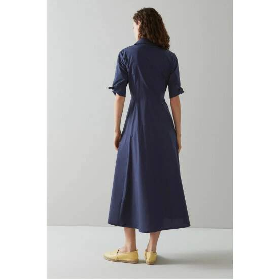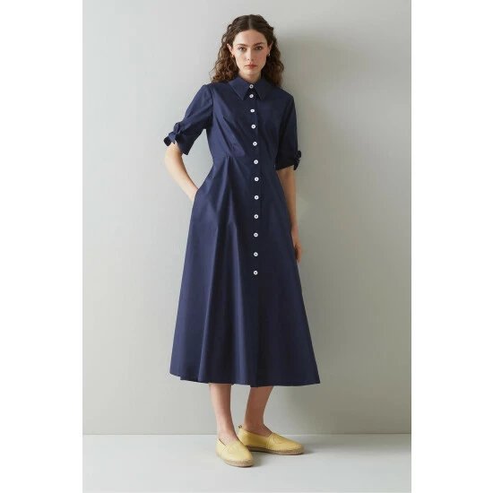 The Saffron shirt dress is crafted from navy blue cotton. It has a neat collar, contrast white buttons, short sleeves with tie detail and a flared midi skirt.