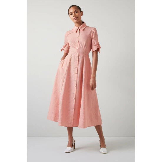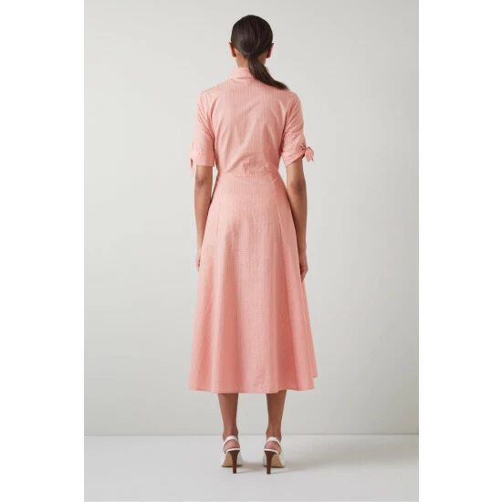 The Saffron shirt dress is crafted from a pink metallic stripe cotton blend. It has a neat collar, cream buttons, short sleeves with tie detail and a flared midi skirt.