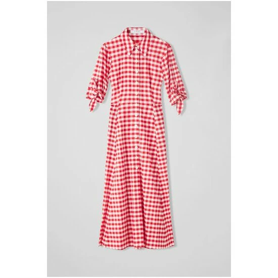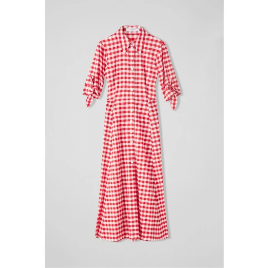 The Saffron shirt dress is crafted from red and white gingham check cotton. It has a neat collar, contrast white buttons, short sleeves with tie detail and a flared midi skirt.
