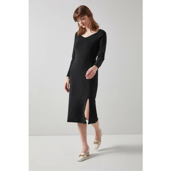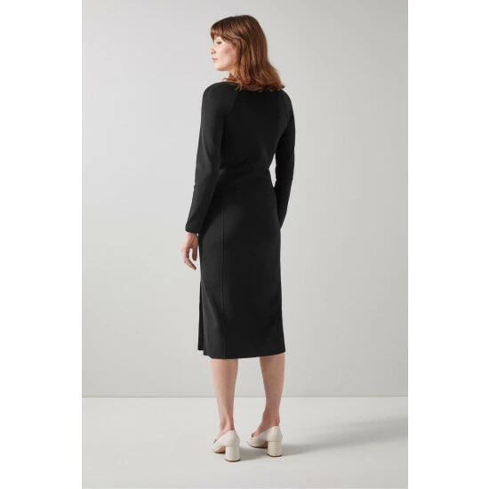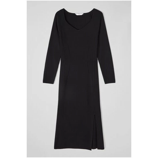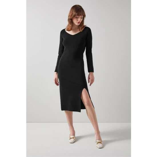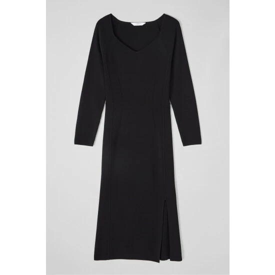 The Scarlett dress is crafted from classic black crepe. It has a feminine sweetheart neckline, long sleeves, a fitted silhouette with seam detail and a slit over one knee.