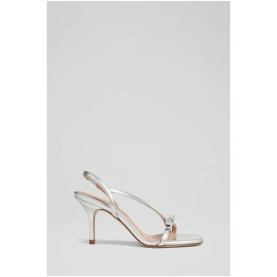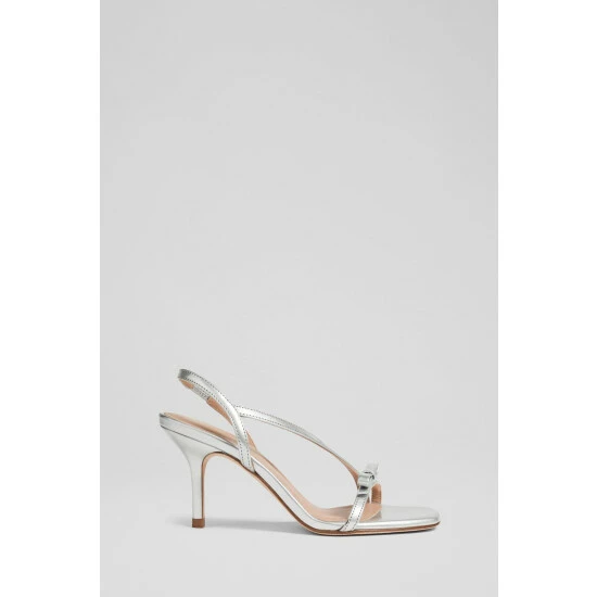 The Serene sandals are crafted in Spain from a silver-blue mirror metallic synthetic leather. They have a strap over the toes embellished with a small bow, an asymmetric strap across the front, an elasticated slingback strap and an 80mm stiletto heel.