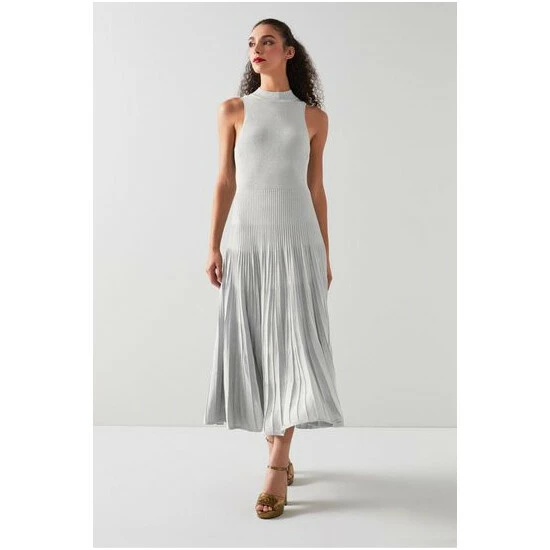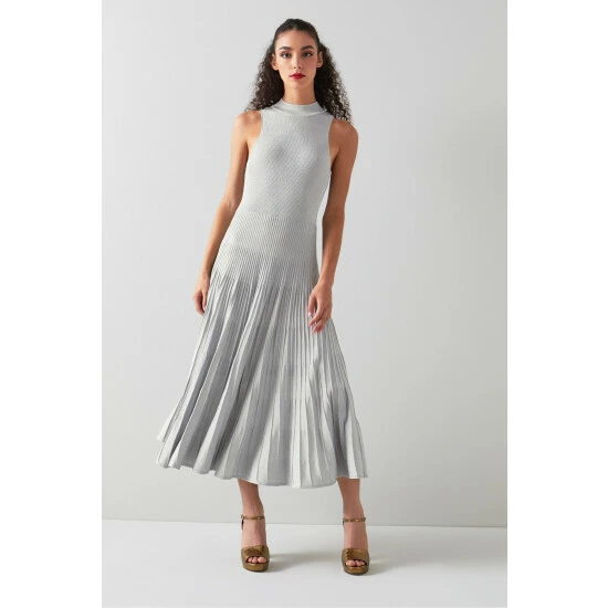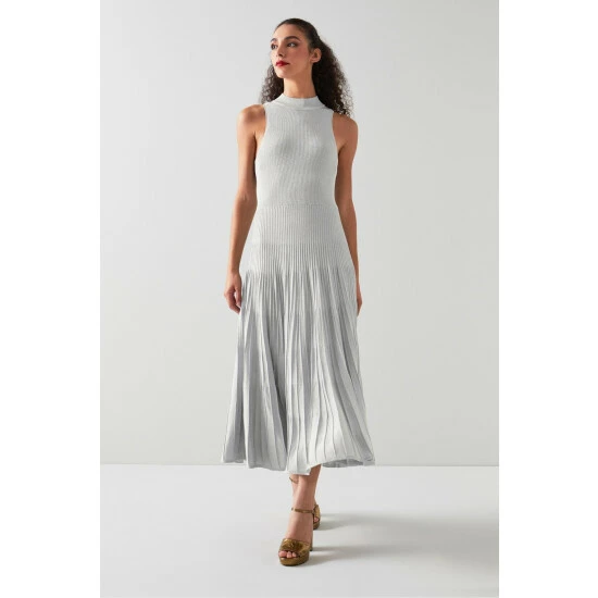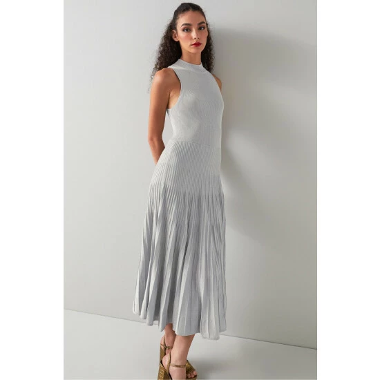The Scott dress is crafted from a silver sparkle knit. It has a turtle neck with a sporty racer cut and an A-line, flippy skirt with pleat detail falling to a midi length.