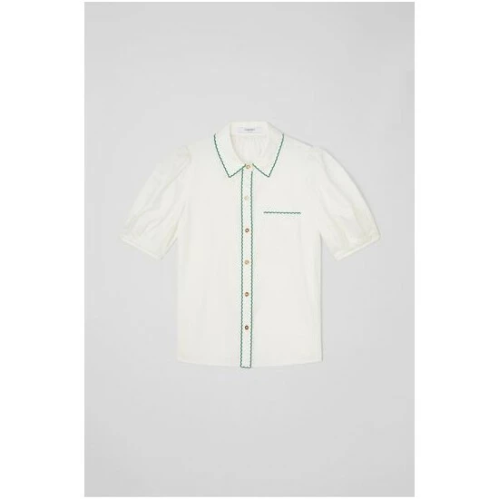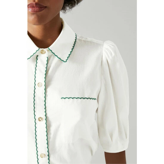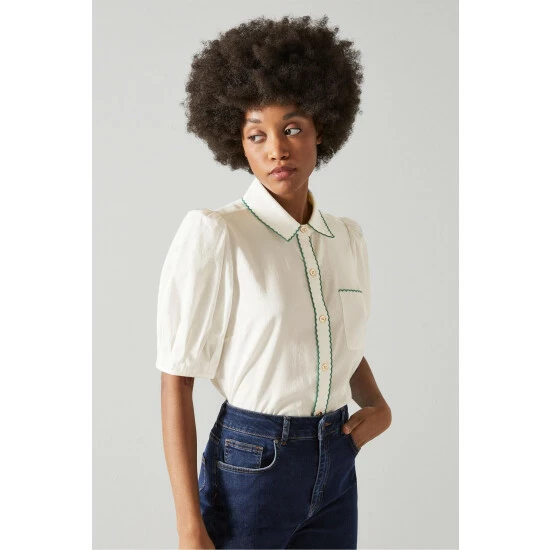 The Simmons blouse is crafted from cream cotton. It has a neat collar, puff shoulders, voluminous short sleeves and a green embroidered scallop trim to the collar, placket and single chest pocket.