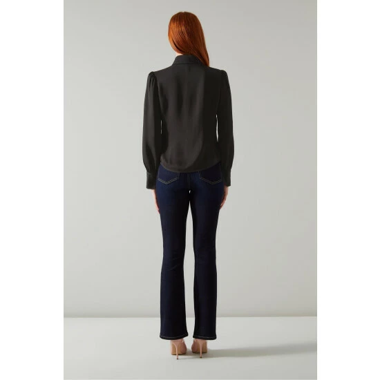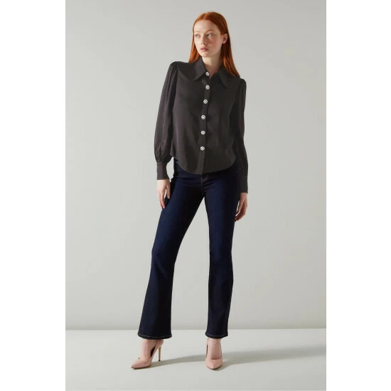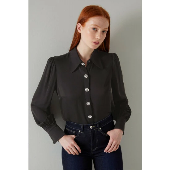 The Sonya blouse is crafted from crépe in black. It has a long, rounded collar, mini puff detail to the shoulders, clear and black crystal buttons and long sleeves with tapered cuffs.