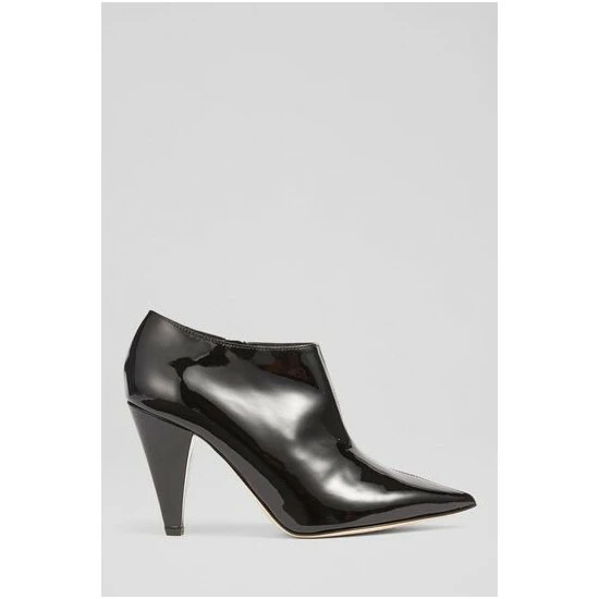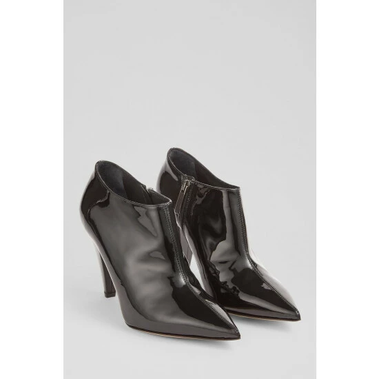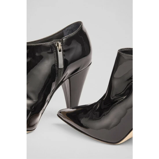 The Talulla shoe boots are crafted in Italy from black patent leather. They have a pointed toe, a low cut, an inside zip and a 90mm cone heel.