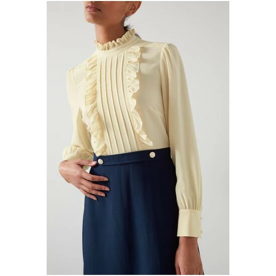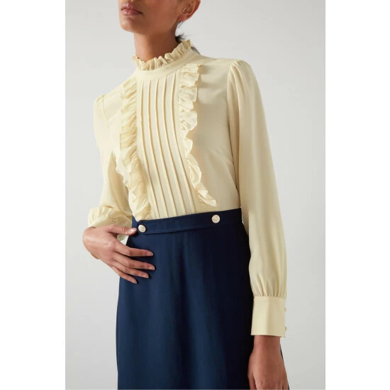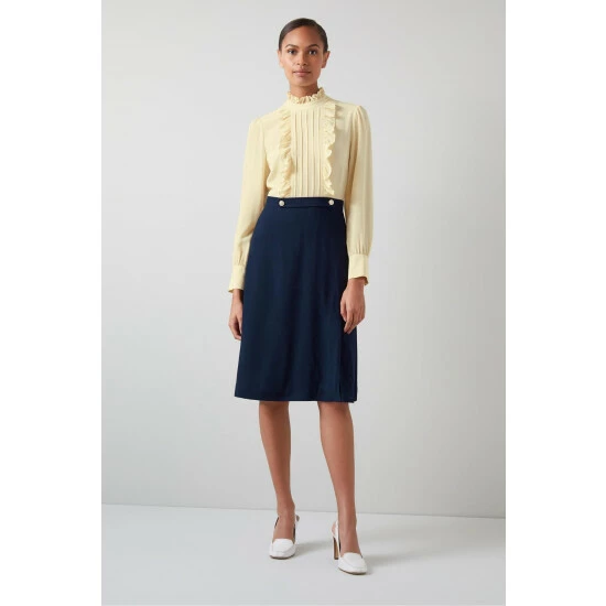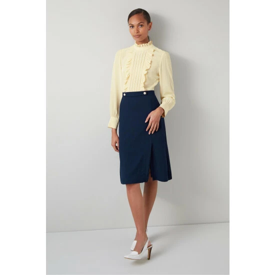 The Tish dress is crafted from cream silk and navy blue crepe. The top has a high neck with a frill edge, a pintucked front with matching trim, puff shoulders, long cuffed sleeves and keyhole detail to the back, while the knee-length skirt sits on the waist with button detail, has an A-line shape and a slit over one knee.