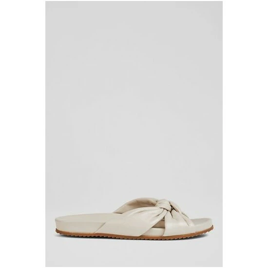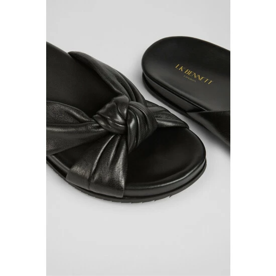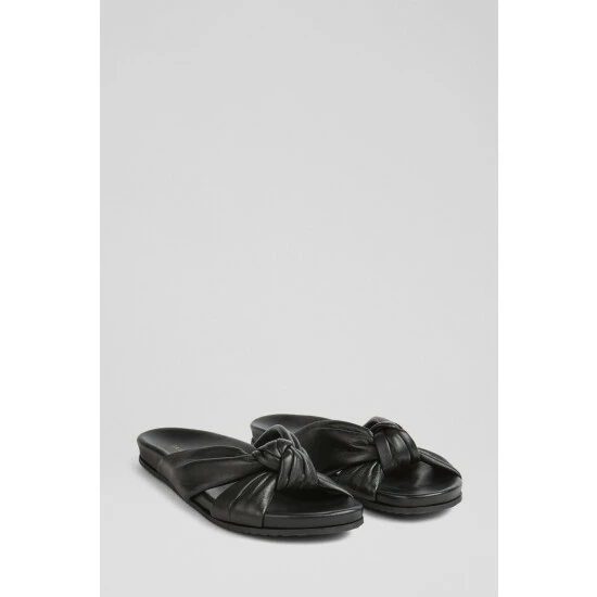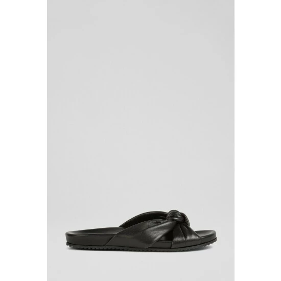 The Valerie sliders are crafted in Spain from nappa leather. They knot over the front of the foot, have a comfortable, shaped footbed and a textured rubber sole.