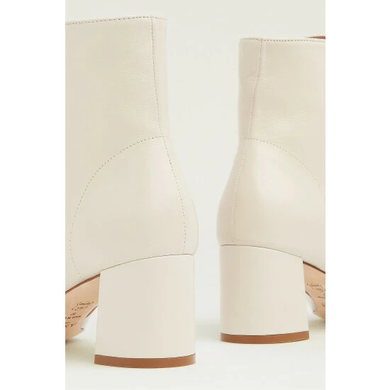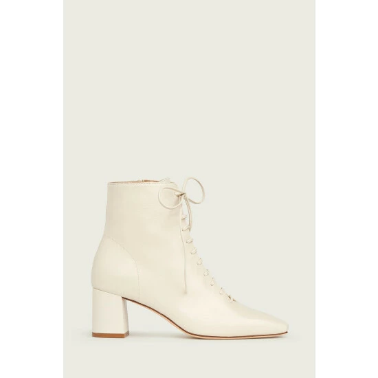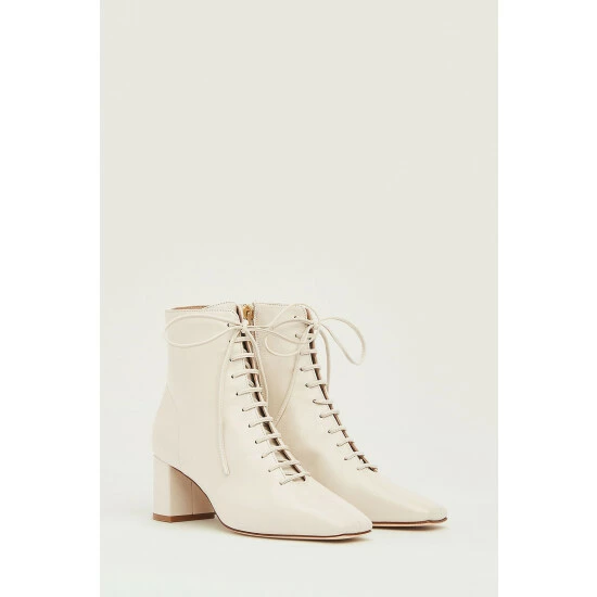 The Arabella ankle boots are crafted in Spain from cream nappa leather. They have a square toe, lace up to the front, have an inside zip and a 60mm block heel.