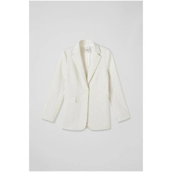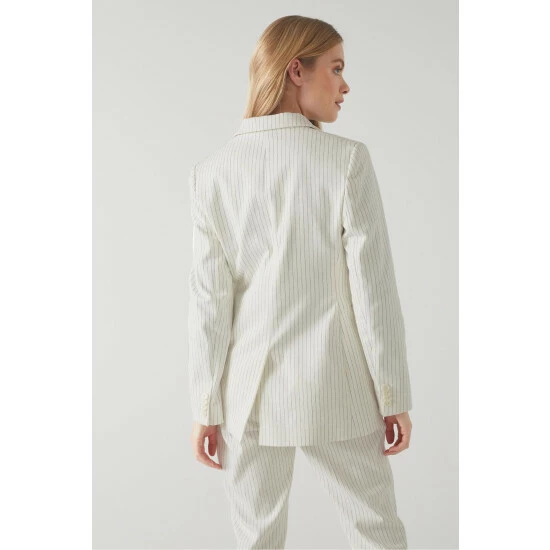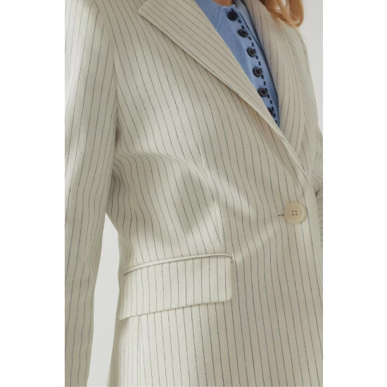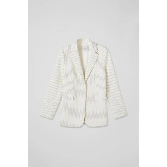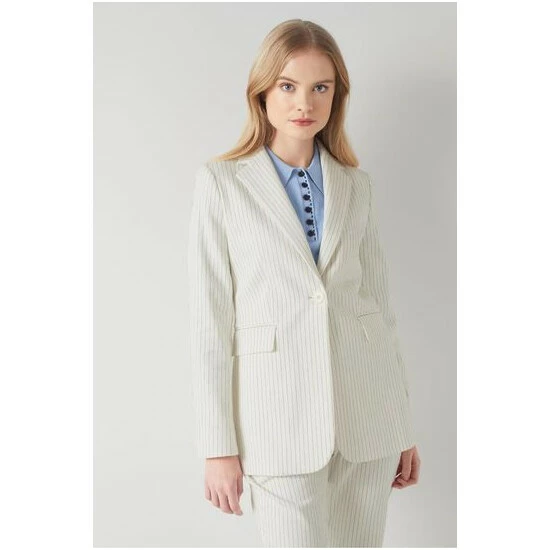 The Bree blazer is crafted in Portugal from white pinstripe stretch cotton. It’s a long line, tailored style with a notch lapel, a single-button fastening, flapover front pockets and a vent to the back.