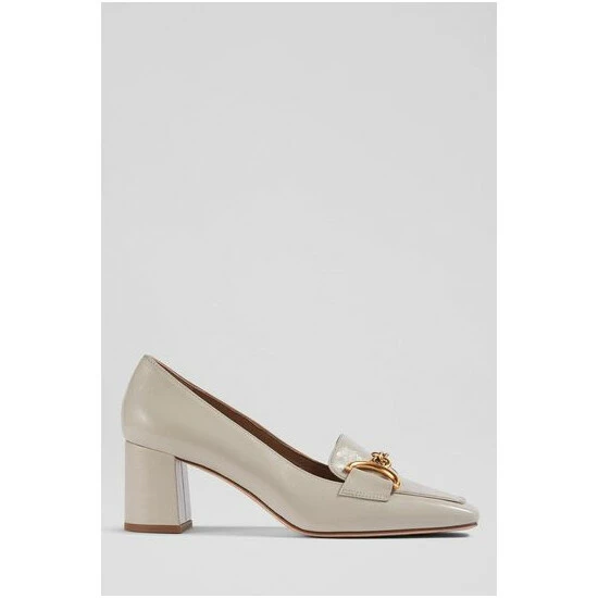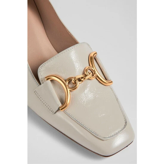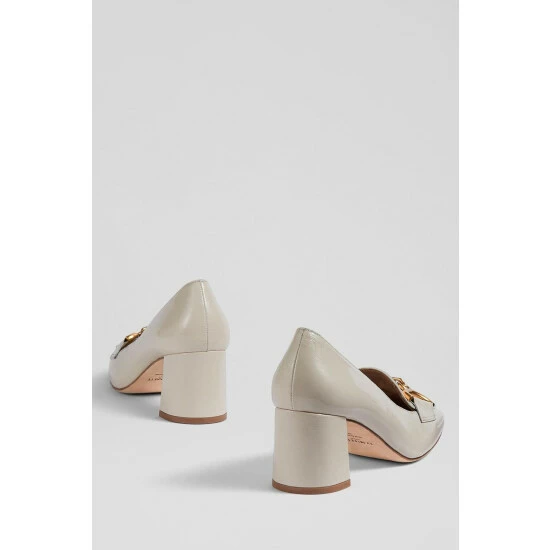 The Samantha court shoes are crafted in Spain from crinkled patent leather in white. They have loafer styling with square toes, gold snaffle detail and 60mm block heels covered in matching patent leather.
