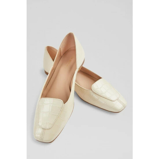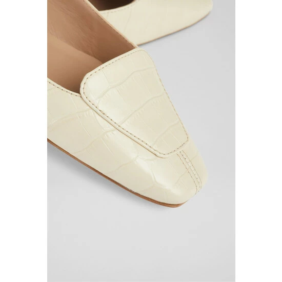 The Willow pumps are crafted in Spain. They have a square toe, loafer styling, a scalloped side cut and a small flat heel.