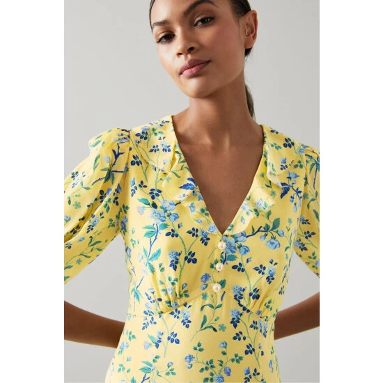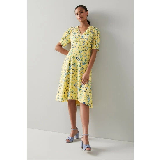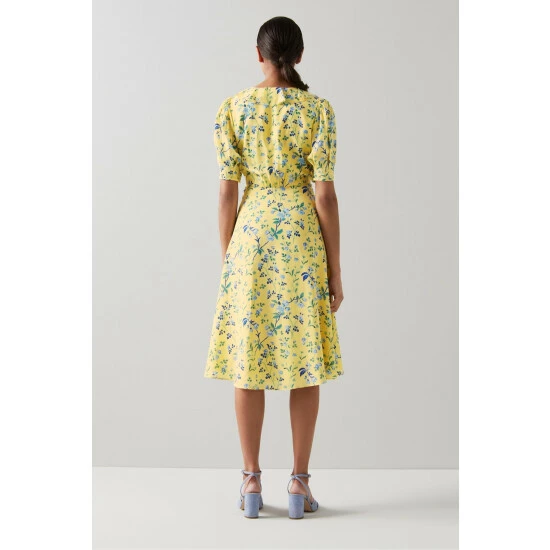 The Pami dress is crafted from yellow silk with a blue and green 18th century apple blossom print. Part of the Royal Ascot x LK Bennett collection, it has a V-neck with a frill edge, a trio of pearl buttons, short pleated sleeves and a tea dress shape with a dipped hem.