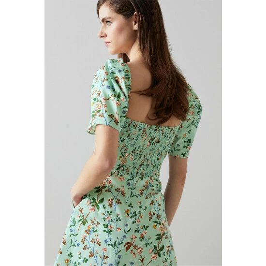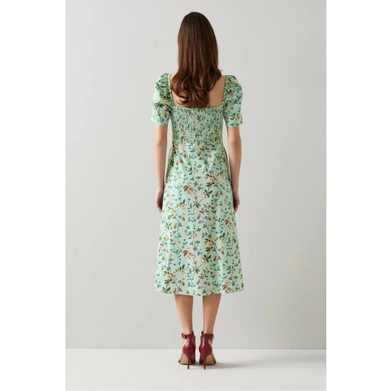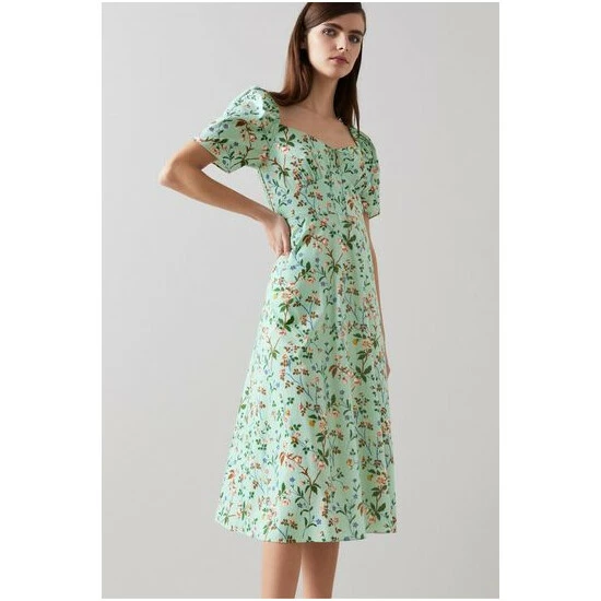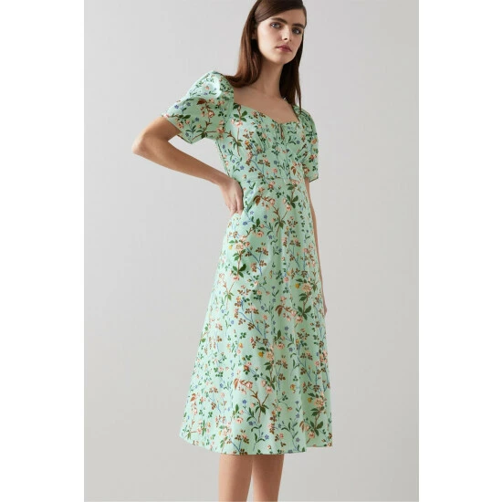 The Phelia dress is crafted from a stretch cotton poplin in mint green with an 18th century apple blossom print in green and pink. Part of the Royal Ascot x LK Bennett collection, it has a sweetheart neckline with tie detail, short puff sleeves, a shirred back and a floaty midi skirt.