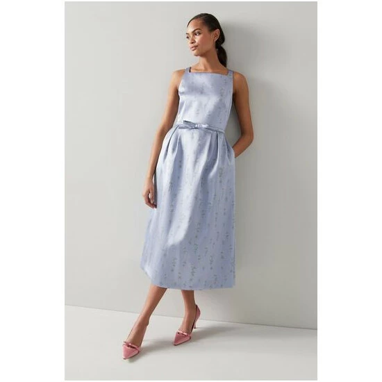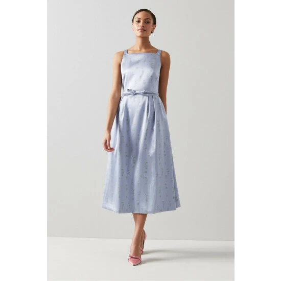 The Rosalind dress is crafted in Portugal from an Italian satin floral jacquard in hyacinth blue with a green floral design. Part of the Royal Ascot x L.K.Bennett collection, it has a square neckline, slim straps, a fitted bodice with bow belt and a full skirt with side pockets that falls to a midi length.