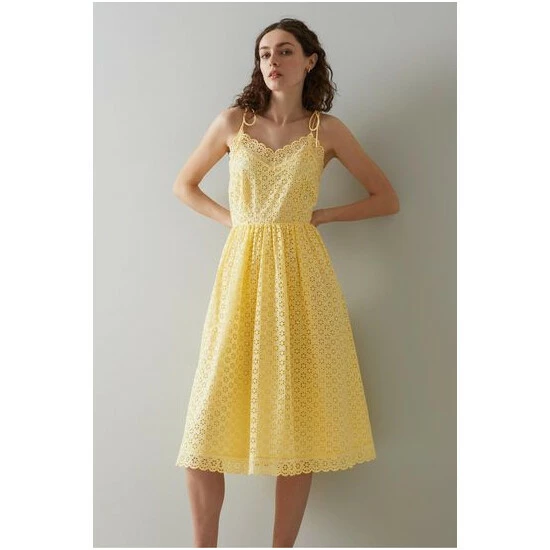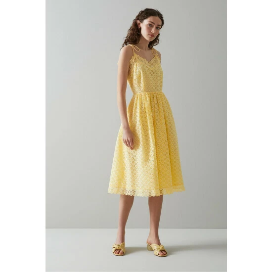 The Francoise sun dress is crafted from yellow cotton by Swiss lace makers, taking inspiration from their archives. It has a V-neck with a scallop edge, tie-up spaghetti straps, a fitted bodice, nipped waist and a pleated full skirt falling to just below the knee.