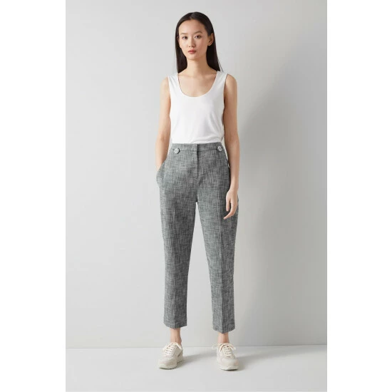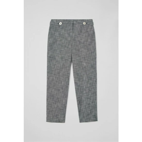 The Zurich trousers are crafted in Portugal from super-light and soft blue denim. They sit on the waist with cream button detail, have a zip fly, side pockets, centre creases and a cropped, cigarette cut.